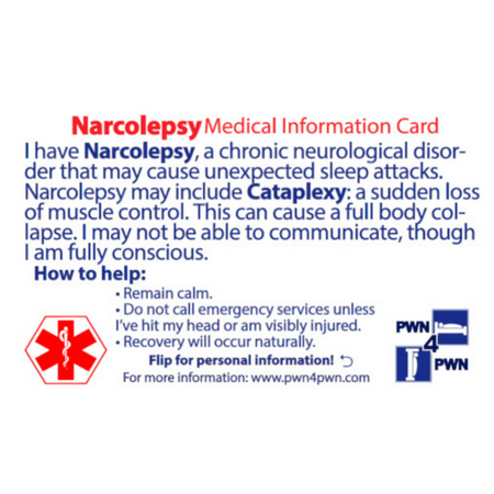 When Cataplexy strikes, you may not be able to speak or explain what’s happening — and that can lead to confusion, fear, or even unsafe situations. That’s why we created the PWN4PWN Cataplexy Medical Info Card — a digital, downloadable card designed to speak for you when you need it most.